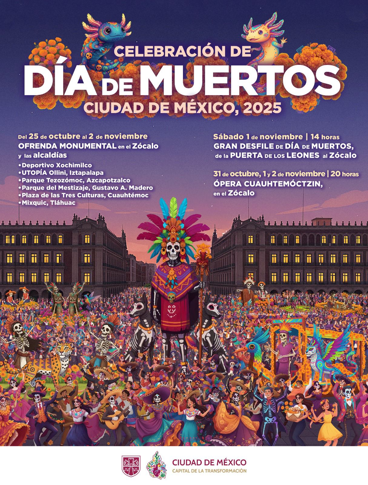 Uno de los grandes atractivos será el Gran Desfile de Día de Muertos, programado para el sábado 1 de noviembre a las 14:00 horas, que partirá desde la Puerta de los Leones del Bosque de Chapultepec hasta la Plaza de la Constitución. En él participarán más de siete mil personas, con carrozas monumentales, comparsas, música y catrinas que llenarán las avenidas principales de color y tradición. Previo al desfile, el 26 de octubre se realizará la Mega Procesión de Catrinas, que contará con más de 16 000 participantes y recorrerá el Paseo de la Reforma.
