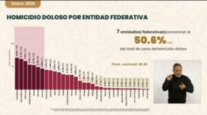 El informe también detalla que siete estados concentran el 50.6 por ciento de los homicidios dolosos en el país: Guanajuato, Baja California, Chihuahua, Estado de México, Sinaloa, Morelos y Guerrero. El promedio nacional durante enero fue de 49.28 casos diarios.